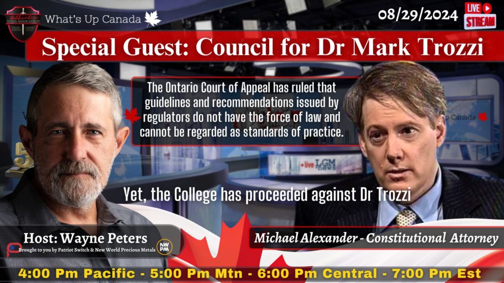Constitutional Attorney Michael Alexander joins us for an update on the precedent setting case of Dr Mark Trozzi against a rogue CPSO gone way out of control. The Ontario Court of Appeal has ruled that guidelines and recommendations issued by regulators do not have the force of law and cannot be regarded as standards of […]
